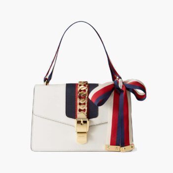 Bolsa de ombro pequena Gucci Sylvie em couro branco com faixa listrada e corrente dourada. Elegância e estilo icônico.