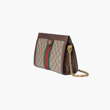 Bolsa de ombro pequena Gucci Ophidia GG com padrão icônico, faixa Web e corrente dourada. Elegância vintage e contemporânea.