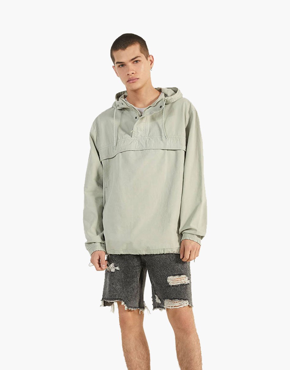 Anorak leve com capuz ajustável e bolso frontal amplo. Ideal para proteção e estilo em diversas atividades.