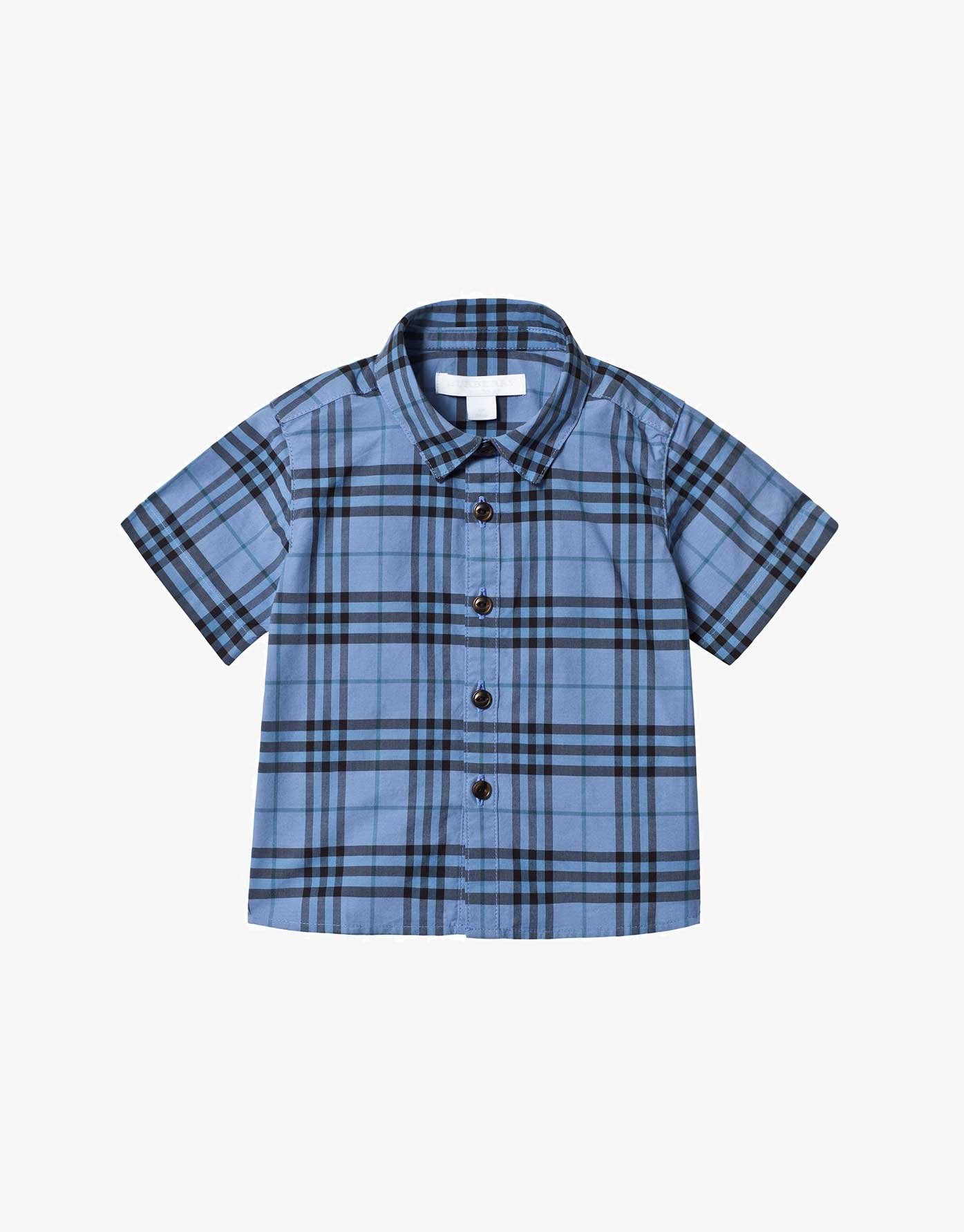 Vista seu pequeno com o estilo clássico e atemporal da Burberry com esta charmosa camisa infantil de manga curta. Confeccionada em tecido macio e respirável, proporciona conforto para o dia a dia. O icônico padrão xadrez da Burberry em tons de azul e preto confere um toque sofisticado e reconhecível à peça.