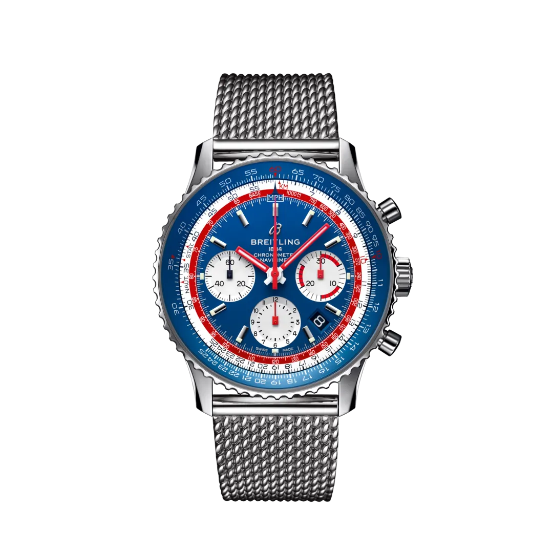 A pulseira de aço inoxidável no estilo “mesh” (malha milanesa) complementa o visual sofisticado e oferece conforto e segurança no pulso. Resistente à água para respingos e uso diário, o Breitling Navitimer B01 Chronograph 43 Pan Am Edition é uma peça de colecionador que combina história, funcionalidade e um design inconfundível. Disponível exclusivamente em nossas boutiques Breitling.
